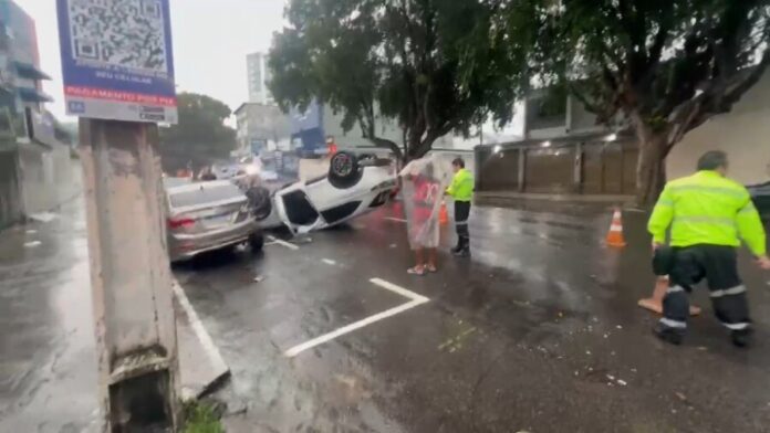 O episódio ocorreu em meio à forte chuva que atinge a cidade desde cedo. As condições da pista são apontadas como possível fator para a perda de controle da direção, circunstância que ainda será apurada.