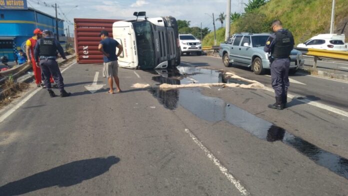 Segundo informações preliminares, a carreta transportava um contêiner e tombou nas proximidades de um centro educacional, em um trecho onde ocorrem obras na via, o que pode ter contribuído para o acidente.
