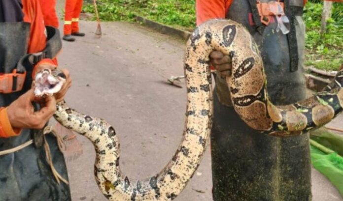 Uma jiboia de aproximadamente 3 metros foi encontrada por uma equipe de limpeza urbana durante trabalhos de rotina realizados na última segunda-feira (16), na Rua Tamanduá Bandeira, no Galo da Serra, em Presidente Figueiredo no Amazonas.