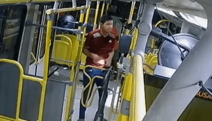 As câmeras de segurança instaladas no interior do ônibus registraram o momento em que os suspeitos se levantam e iniciam a abordagem aos trabalhadores e passageiros.