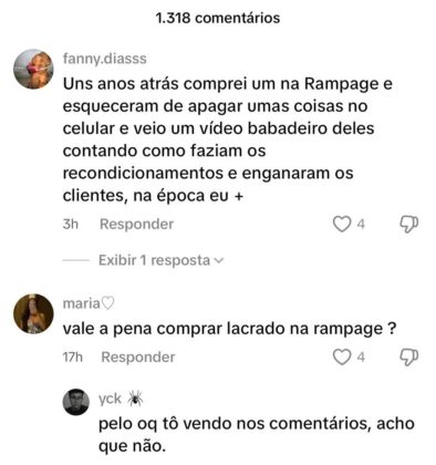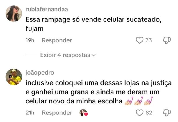 Outros consumidores também compartilharam experiências negativas com a mesma loja. “Comprei um celular lá anos atrás, e esqueceram de apagar um vídeo interno onde explicavam como enganavam os clientes com os recondicionamentos”, disse uma usuária. “Me venderam um iPhone dizendo que a bateria era original e nunca havia sido trocada, mas o aparelho desligava sozinho mesmo com 100% de carga”, relatou outro. Confira: